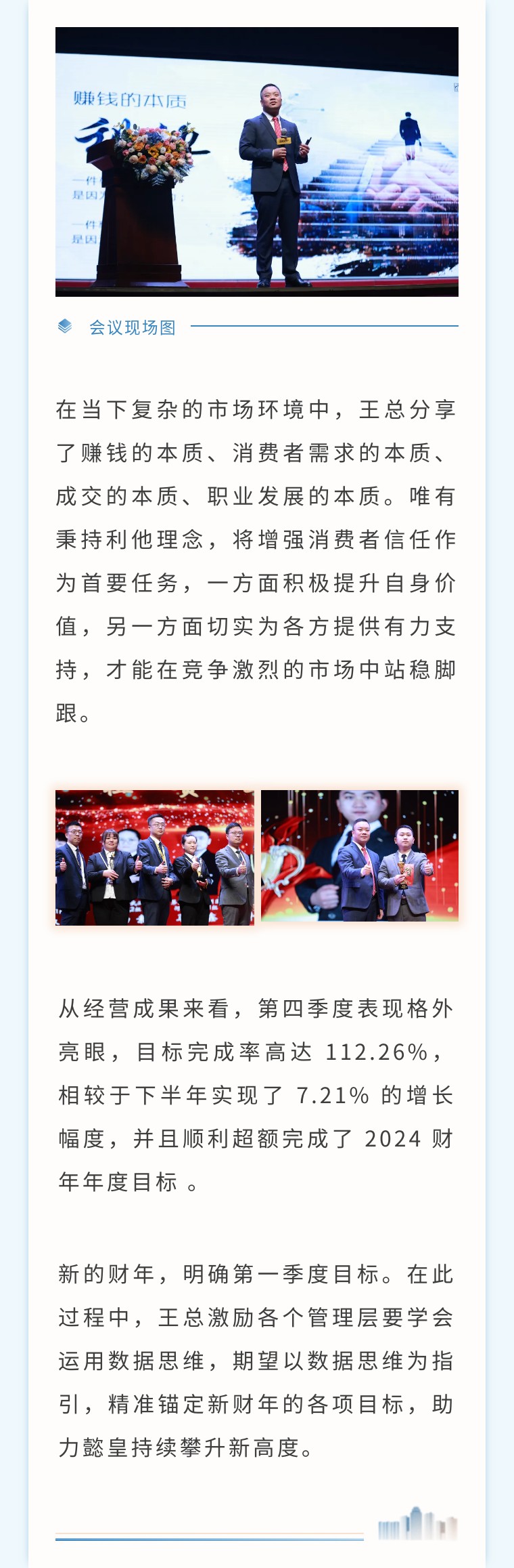 回首第四季度,我們以無畏之姿,披荊斬棘,斬獲了一項項斐然成就,那是全體同仁汗水與智慧的結晶。如今,第一季度大會的集結號已然吹響,讓我們懷揣熱血與豪情,奔赴這場盛會,攜手在新季度中踏浪前行,再創輝煌,向著更高峰奮勇攀登,鐫刻屬于我們的璀璨榮耀!